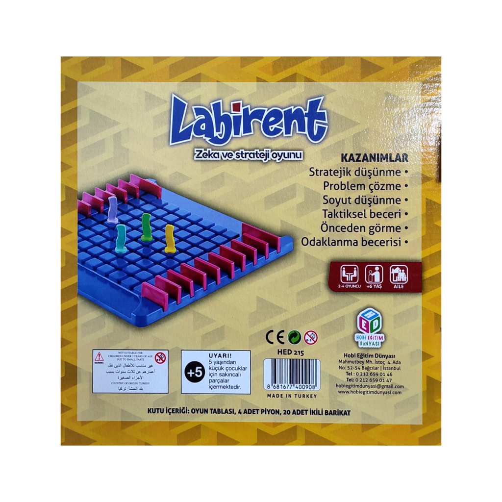 Labirent Zeka ve Strateji OyunuLabirent Oyunu 2 veya 4 kişi ile oynanabilen bir kuramsal strateji ve taktik oyunudur.Dünya çapında bir çok ödüle sahip özel bir oyundur.Labirent Oyunu 81 kare parçalı (9x9) bir oyun tahtası üzerinde oynanmaktadır.Oyunun hedefi kare çizgiye rakibinden önce ulaşmaktır.Oyunun başında her oyunucu 10 adet engeli, oyun platformunun kendisine yakın olan bölümüne dizer.Her oyuncu kendi taşını, engellerin önündeki sıranın orta karesine yerleştirir. Oyuna önce başlayacak oyuncu kura ile belirlenir.Her oyuncu sırası geldiğinde taşıyla bir hamle yapmayı veya engel koymayı tercih edebilir.Eğer oyuncunun engelleri bitmiş ise mecburen taşı ile hamle yapması gerekmektedir.Taş ile her seferinde, sırası geldiği zaman öne, arkaya veya yanlara sadece bir kare gidilebilir. Taşlar engellerin üzerinden atlayamazlar ve mecburen engelin çevresinden dolaşmak zorundadırlar. Her engel iki kareyi engelleyecek şekilde konur. Engel koymada amaç oyunucunun kendi ilerleyişiniz kolaylaştırmak ve rakibinin yolunu uzatmaktır.Rakibinin rakibinin ilerleyişini engellerken, rakibin yolunu tamamen kapatmak yasaktır.Rakibe en az bir geçiş karesi bırakmak şarttır.İki oyuncunun taşı arada engel olmaksızın karşı karşıya gelecek olurlarsa, sırası gelen oyuncu rakibinintaşının üzerinden atlayabilir.Karşı çizgideki 9 kareden herhangi birine ilk ulaşan oyuncu oyunu kazanır.Oyunun süresi 10 ile 20 dakika arasında değişmektedir. İsteğe göre sürede sınırlama yapılabilir.4 Oyuncu ile oynanacağı zaman her oyuncuya 4 engel verilir. Oyun saat yönünde ilerleyerek oynanır.Diğer kurallar iki kişi ile olan kuralların aynısıdır.Çocukların zeka ve taktik becerilerinin gelişmesi için uzmanlar tarafından tavsiye edilen bir oyundur.Çocukların dikkat dağınıklığı problemi için etkili bir oyundur.KAZANIMLAR:Stratejik düşünmeProblem çözmeSoyut düşünceTaktiksel beceriÖnceden görmeOdaklanma becerisiYaş Grubu : 6+ YaşBarkodu: 8681677400908Item No : HED260Kutu Ölçüleri : 28,2 x 27,5 x 6,7 cm.Desi Değeri: 2