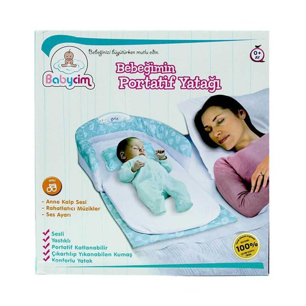 Bebeğimin Portatif Yatağı; anne kalp sesi, rahatlatıcı müzikler ve ses ayarı özelliği olan, yastıklı, portatif katlanabilir, çıkartılıp yıkanabilen kumaş, konforlu yatak, yumuşak doku, nefes alabilen kumaş özelliğine sahiptir.